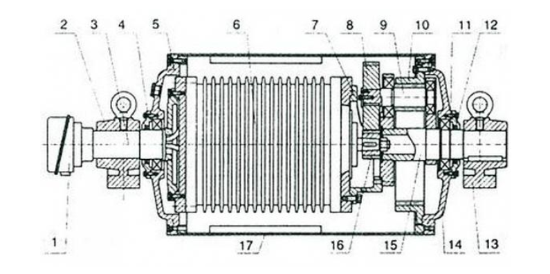 電動滾筒的構造圖它主要由支座、滾筒體、驅(qū)動電機、左右法蘭軸、齒輪、齠輪和內(nèi)齒圈等構成。左右法蘭軸及驅(qū)動電機外殼連結成連續(xù)的抗彎梁,接受膠帶的拉力,電動機經(jīng)兩級齒輪減速后,帶動滾筒體旋轉(zhuǎn),在滾筒轉(zhuǎn)動時,焊接在滾筒內(nèi)壁上的刮油板帶起注入滾筒內(nèi)的機油,從而完成對電機、齒輪、軸承等零部件的冷卻和光滑。