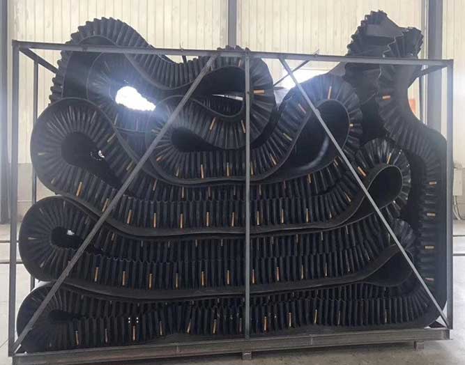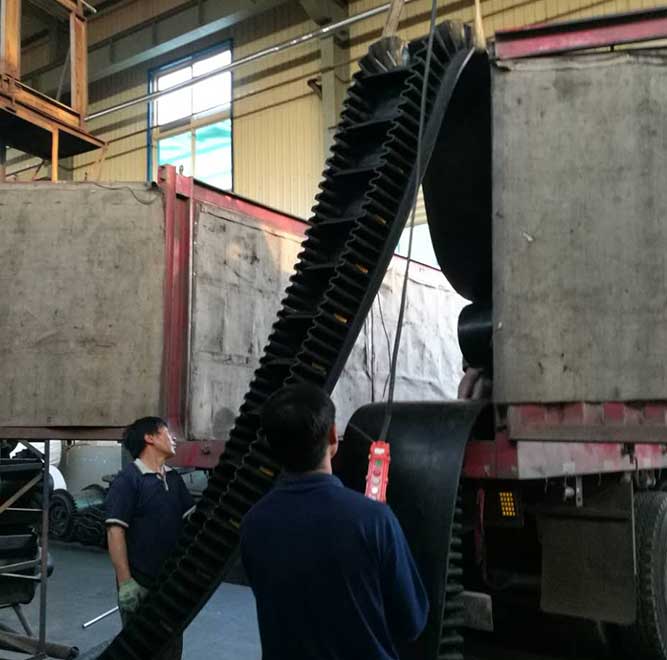 大傾角波狀擋邊帶由基帶、擋邊和橫隔3部分組成。擋邊起防止物料測滑撒落的作用。為便于繞過滾筒,同時避免擋板的拉扯損壞,檔邊設計成波紋狀;橫隔板的作用是承托物料,為了實現大傾角輸送,采用T型TC型。檔邊和橫隔板是用二次硫化的方法與基帶連接的,具有很高的連接強度。大傾角波狀擋邊帶則是由本身的基帶實現物料的運輸,基帶內部根據不同的運輸情況選擇不同的布層,常用的有普棉,尼龍,聚酯,鋼絲繩芯等多種布層。拉力依次增加,需要知道自己選擇什么樣的布層拉力可以詢問您的生產技術人員或者與我們的技術人員進行溝通。