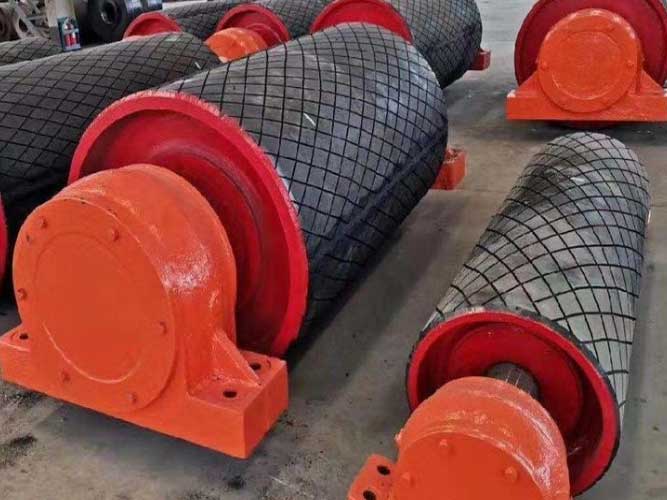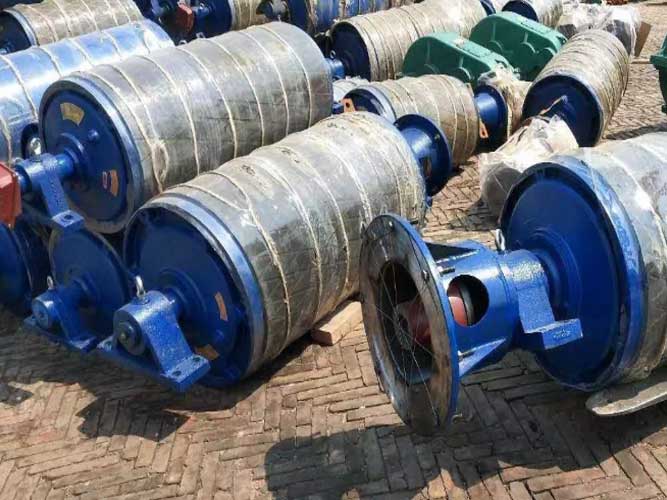 當(dāng)驅(qū)動裝置運(yùn)轉(zhuǎn)時,驅(qū)動裝置中的扭矩傳送到傳動滾筒軸上,再由軸通過內(nèi)部脹套(或者鍵)連接進(jìn)而把扭矩傳送到筒體上,由于滾筒與皮帶之間的摩擦力,后將扭矩傳送到皮帶上帶動整條皮帶輸送機(jī)的運(yùn)轉(zhuǎn)。